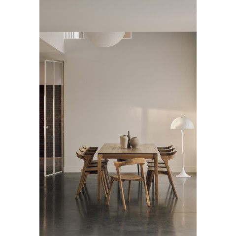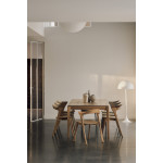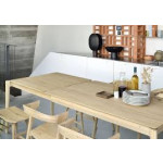 La table de la même gamme ne déroge pas à la règle avec son piétement et plateau en chêne massif et son style minimaliste.
